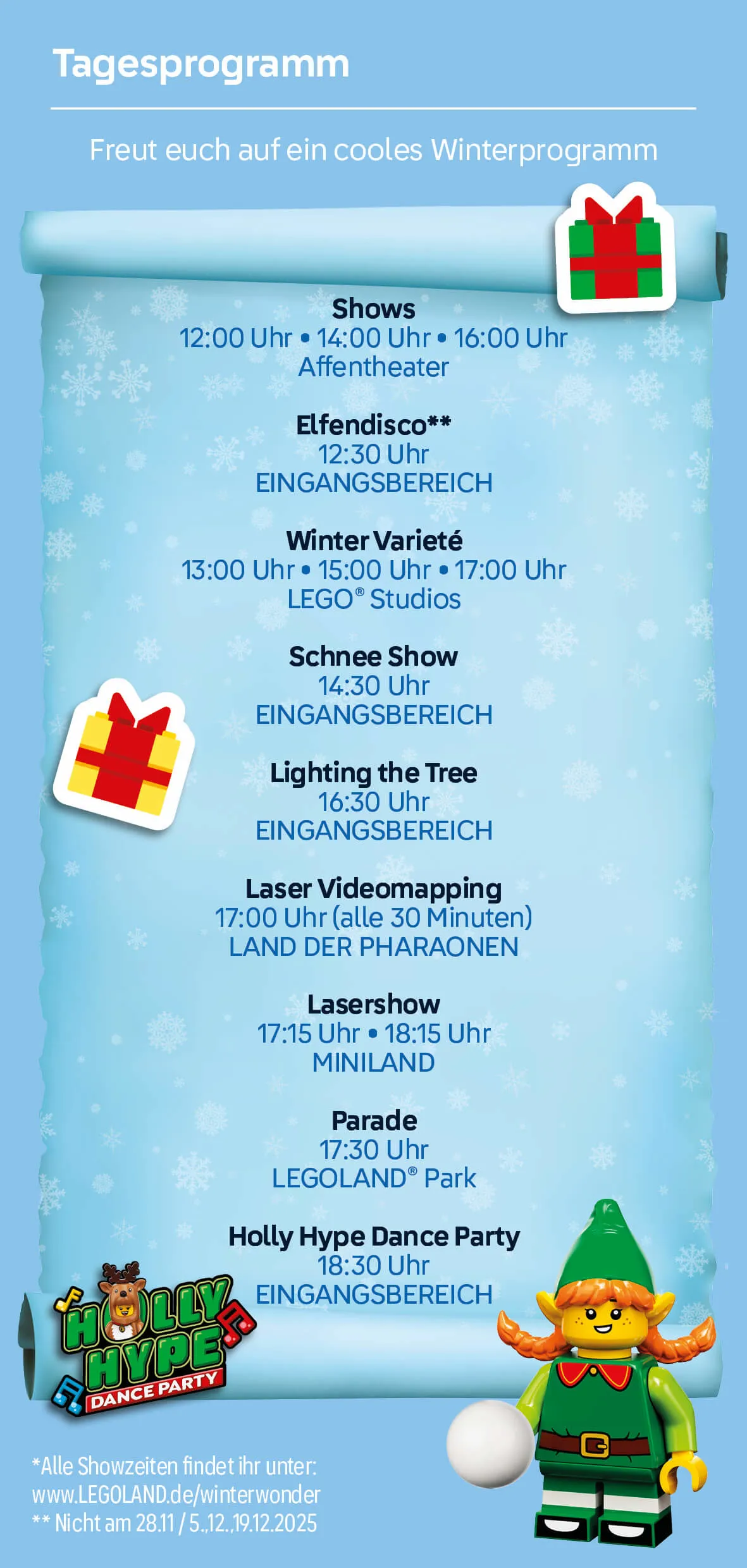 - Um den Park zu betreten und den Weihnachtsmann zu besuchen, muss pro Person (ab 2 J.) ein zusätzliches WinterWonder LEGOLAND® Ticket (Tageskarte o. Pass) gekauft werden.