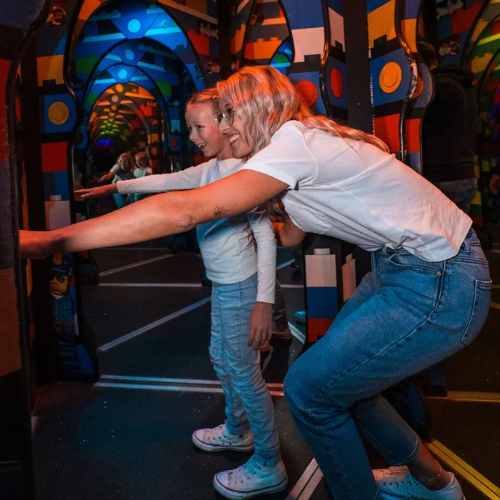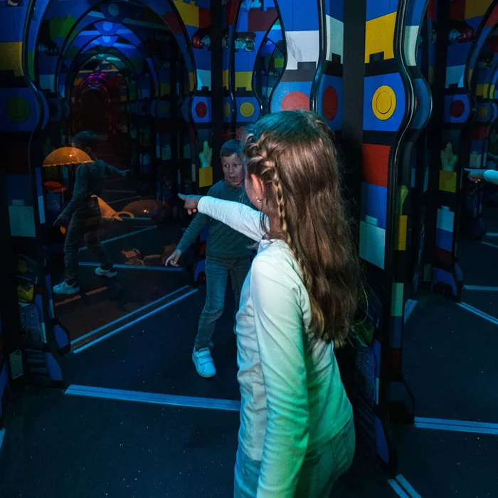 Partecipate a una caccia all'uomo spericolata nel labirinto degli specchi. La polizia LEGO® ha bisogno del vostro aiuto per catturare i pericolosi ladri che cercano di fuggire con il loro bottino. Dovrete superare ostacoli come gli specchi folli, il pavimento che gira e le barriere laser installate dai gangster.