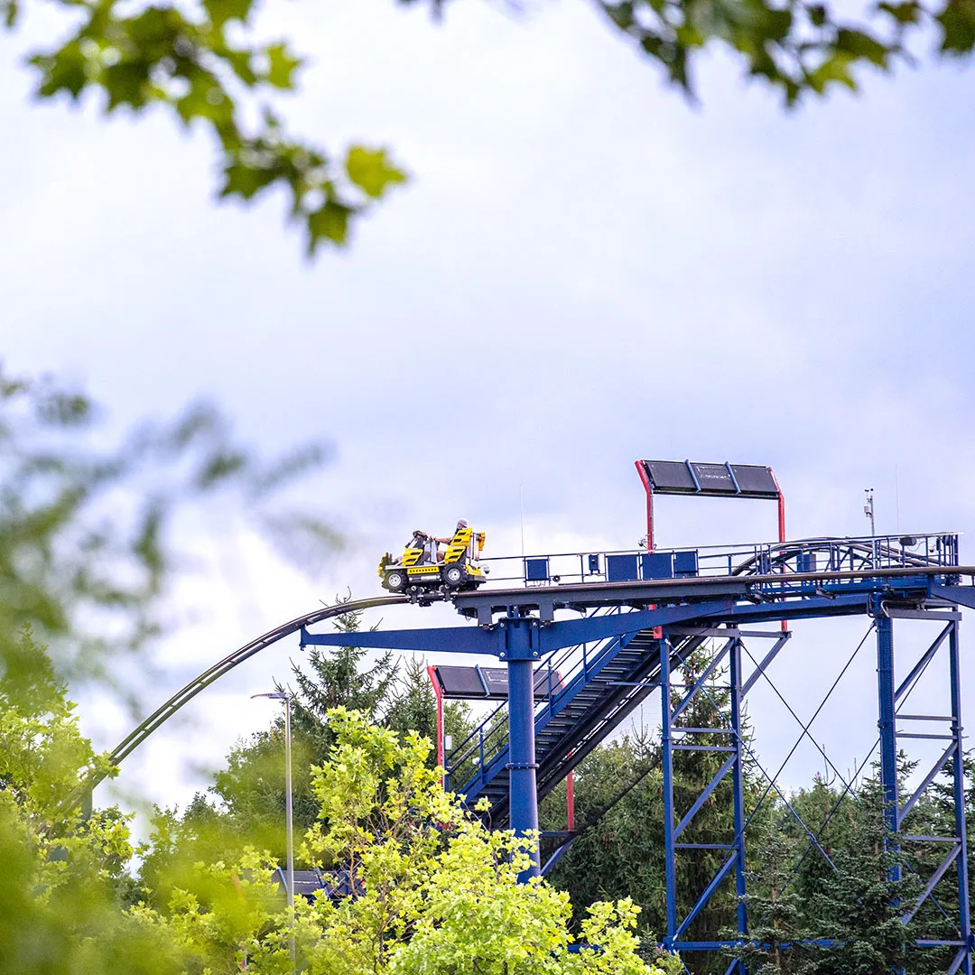 Macht euch bereit für ein außergewöhnliches Achterbahn-Erlebnis! Rein ins Rennauto und los geht die spannende Fahrt.