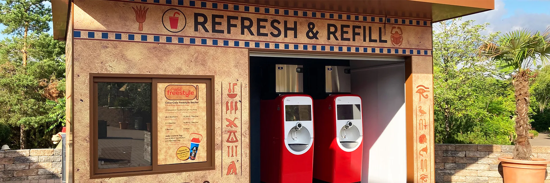 Mit dem Coca-Cola freestyle Becher habt ihr eine Flatrate für den ganzen Tag und könnt am Kauftag unbegrenzt an den drei Stationen nachfüllen. (Bitte berücksichtigt, dass das Wiederbefüllen erst nach 10 Minuten wieder möglich ist und nur während der Parköffnungszeiten.)