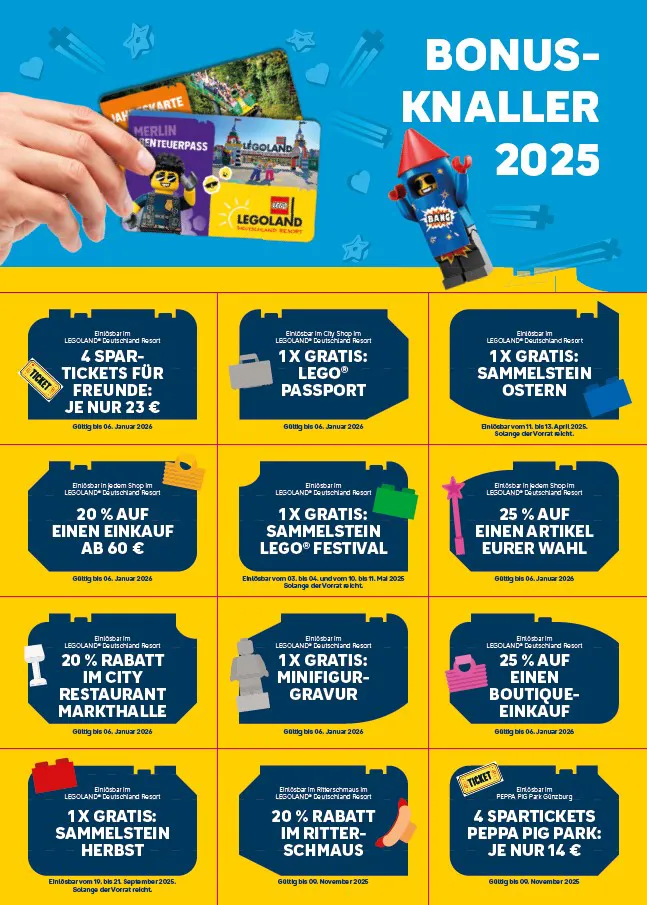 Um die mit der LEGOLAND Jahreskarte verbundenen Vergünstigungen für einen Aufenthalt im LEGOLAND Feriendorf in Anspruch zu nehmen, klickt bitte hier.