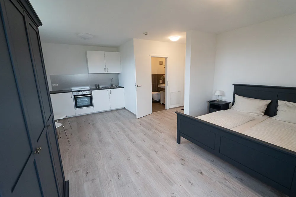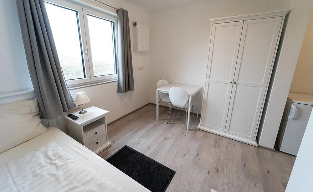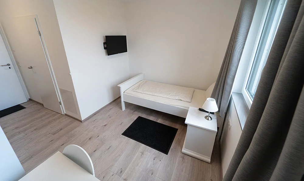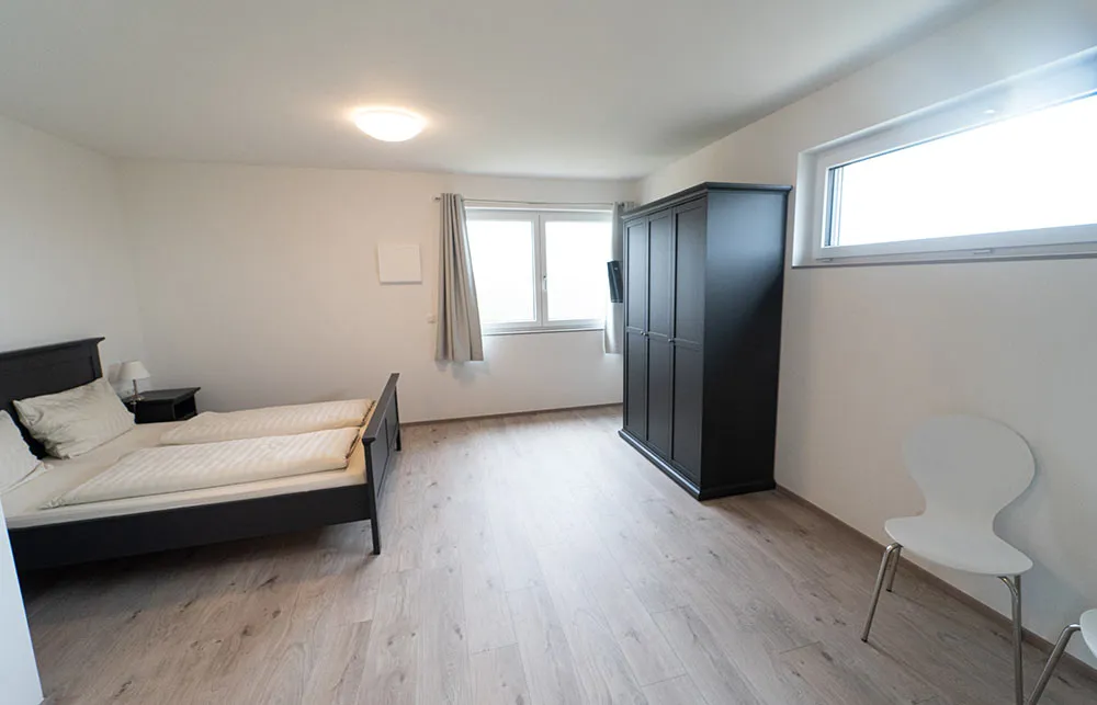 Die Zimmer unserer Mitarbeiterunterkünfte sind mit Bett, einem geräumigen Schrank, Kühlschrank, Flachbildfernseher sowie WC und Dusche bestens ausgestattet und verbreiten dank des großen Fensters und der guten Raumaufteilung eine angenehme Atmosphäre. Alle Unterkünfte sind über WLAN mit einem Internetzugang versorgt.