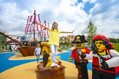 Nach Parkschluss geht das Abenteuer im LEGOLAND® Feriendorf weiter: Das einzigartige Pirateninsel Hotel, drei königliche Burgen, liebevoll thematisierte Häuser sowie Campingfässer und ein Campingplatz laden zur Übernachtung nach einem aufregenden Parktag ein.