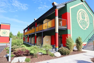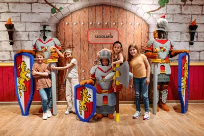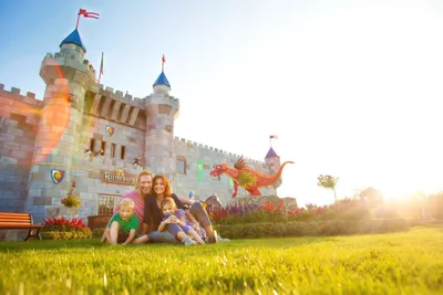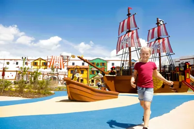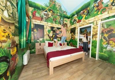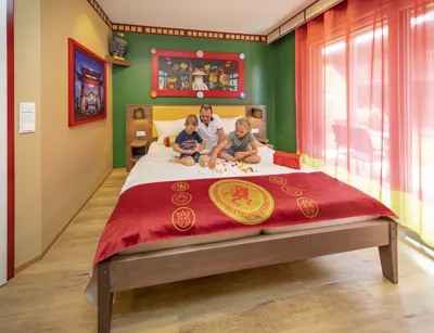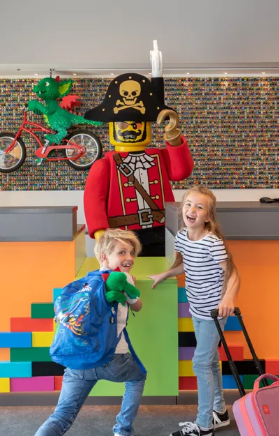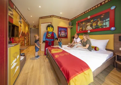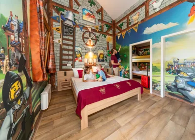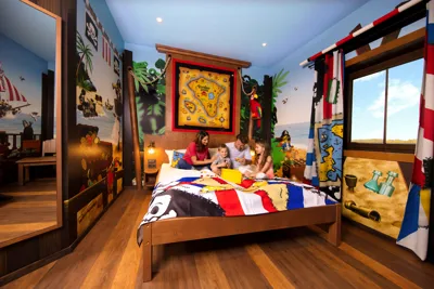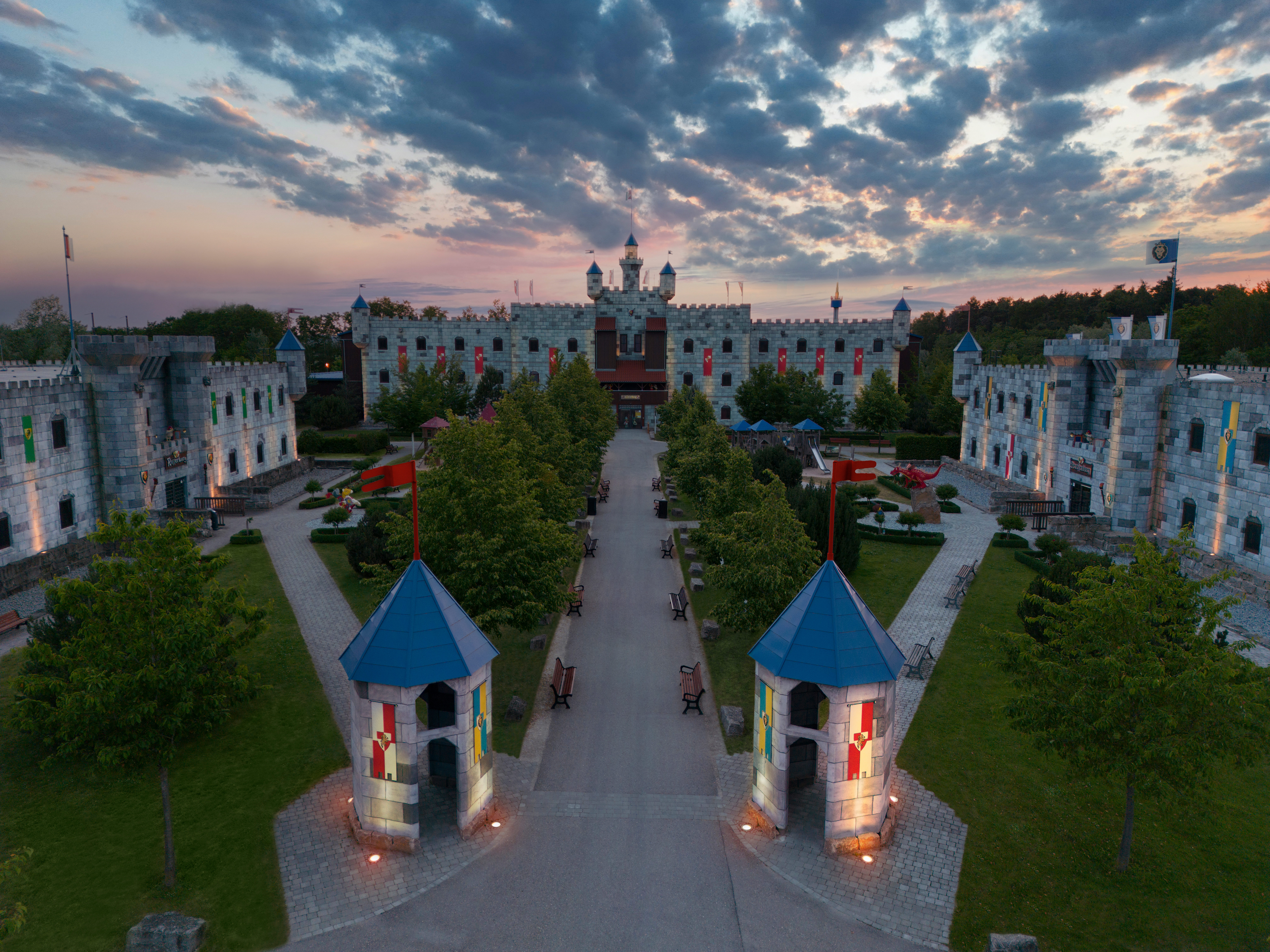 Nach Parkschluss geht das Abenteuer im LEGOLAND® Feriendorf weiter: Das einzigartige Pirateninsel Hotel, drei königliche Burgen, liebevoll thematisierte Häuser sowie Campingfässer und ein Campingplatz laden zur Übernachtung nach einem aufregenden Parktag ein.