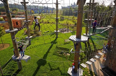 Für Unterhaltung im LEGOLAND Feriendorf ist mit zahlreichen Spielplätzen, Piratengolf, einem Hochseilgarten, Bowlingbahnen und verschiedenen Restaurants und Bars bestens gesorgt.