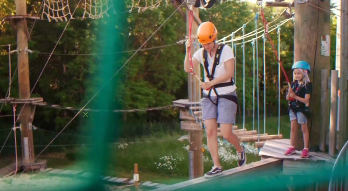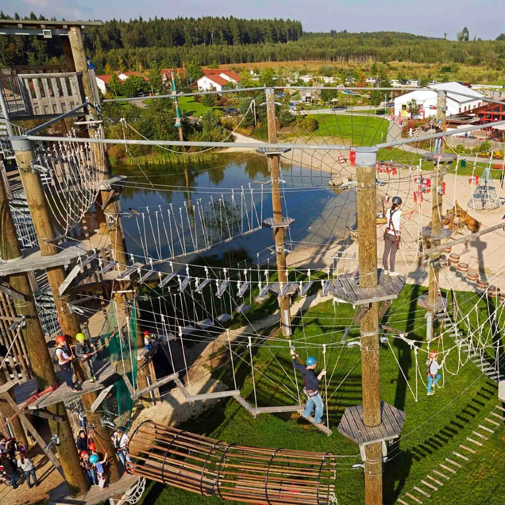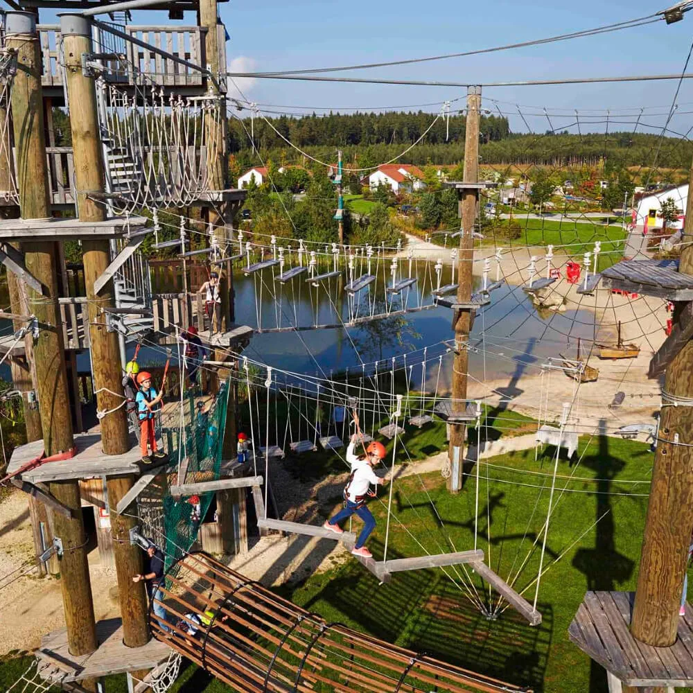 Im Hochseilgarten laden sechs verschiedene Parcours mit 42 Elementen Kinder (ab vier Jahren) und Erwachsene ein, ihre Grenzen und Fähigkeiten zu testen. Manchmal geht es sogar nur auf einem fliegenden Teppich, einem Snowboard oder über eine Bobby-Car-Brücke weiter. Beim krönenden Abschluss braucht ihr dann besonders viel Mut: Ihr fliegt an einer 300 Meter langen Zipline übers Wasser, bis ihr wieder am Ausgangspunkt ankommt.